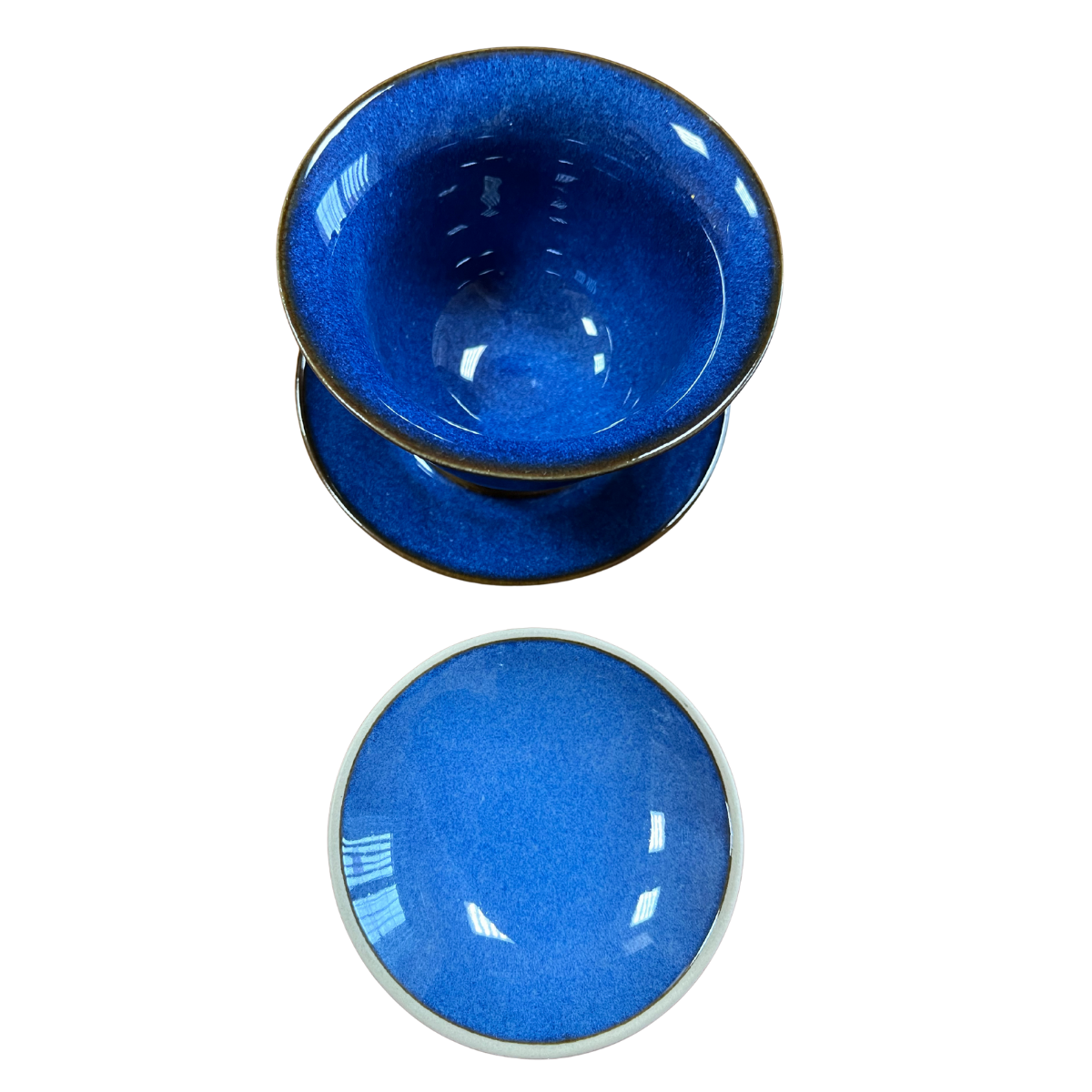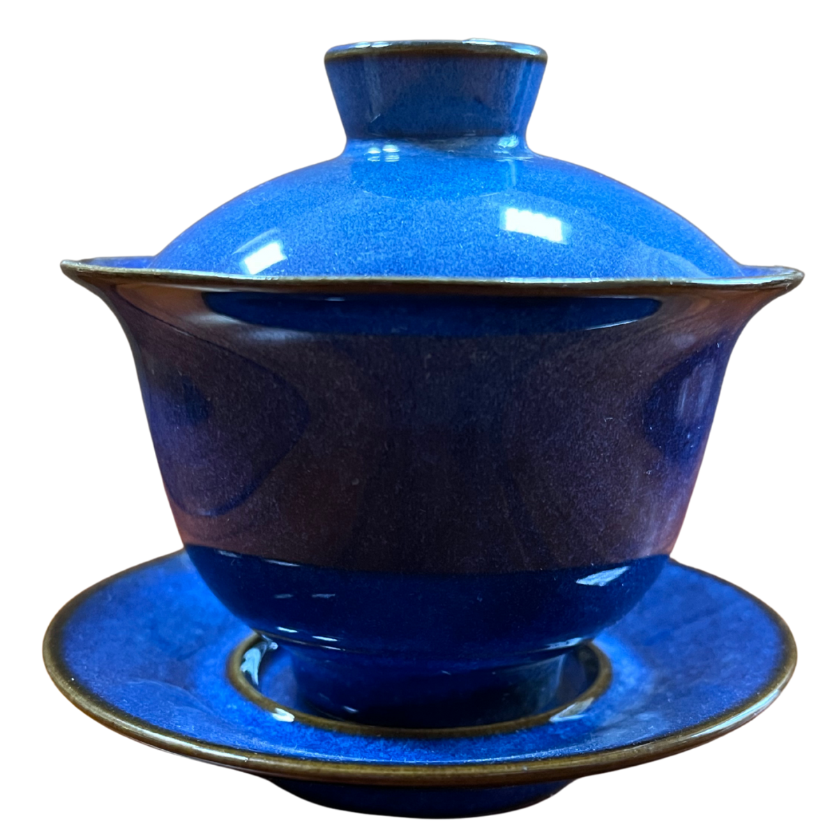 Гайвань изготовлена из тонкой глазурованной керамики глубокого синего цвета с нежным градиентом и лёгким блеском глазури. Тёплый коричневый кант по краю крышки, пиалы и блюдца придаёт изделию изысканность и завершённость.